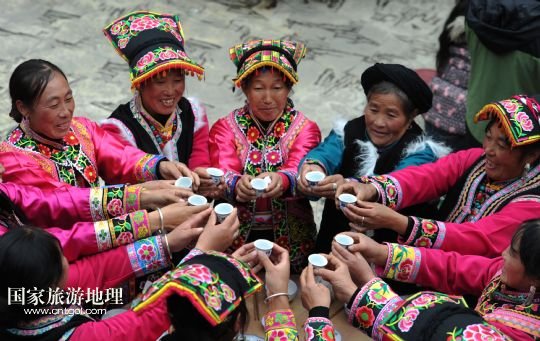 國家旅游地理 四川阿壩11月2日訊 11月2日,身著節(jié)日盛裝的四川省阿壩州汶川縣龍溪鄉(xiāng)村民們舉杯迎接羌歷新年的到來。當日,四川省阿壩州汶川縣龍溪鄉(xiāng)舉行傳統(tǒng)儀式迎接即將到來的羌歷新年。今年的11月3日農(nóng)歷十月初一是羌歷新年,這是羌族一年中最為隆重的“慶豐收、送祝福、祈平安”的節(jié)日,按民間習俗,過羌年時要還愿敬神,全寨人歡聚一堂,吃團圓飯,共慶佳節(jié)。 /新華社發(fā)(何海洋 攝)