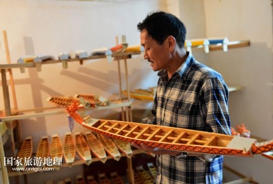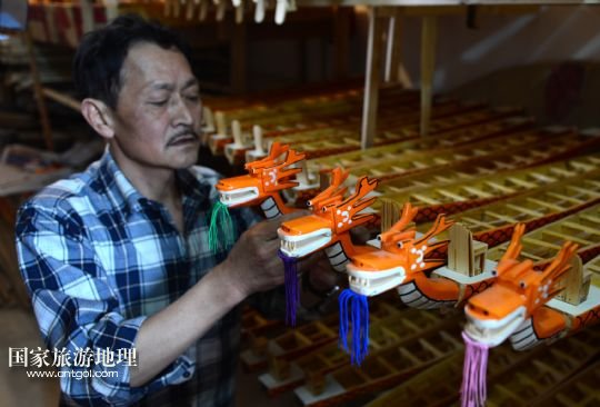 國家旅游地理 湖北宜昌5月15人訊 5月15日,手工藝人鄭祥龍在為微型龍舟上龍頭。端午節(jié)臨近,屈原故里湖北省秭歸縣歸州鎮(zhèn)手工藝人鄭祥龍精心制作一條條微型木制龍舟,準(zhǔn)備在端午文化節(jié)期間向中外游客進行展示。