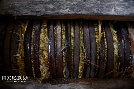 6月21日,在湖北省宣恩縣箭竹坪村的榨油房里,菜餅被整齊地放入榨槽。