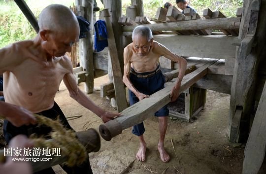 國家旅游地理 湖北恩施6月23日訊 6月21日,在湖北省宣恩縣箭竹坪村的榨油房里,“打榨佬”們揮舞撞錘猛擊楔子。紀(jì)錄片《舌尖上的中國》第二季熱播,讓片子中出現(xiàn)的手工榨油技藝進(jìn)入公眾的視野。在湖北西部山區(qū)恩施土家族苗族自治州宣恩縣李家河鄉(xiāng)箭竹坪村,依然留存有手工榨油的榨房及一批身懷絕技的手藝人。
