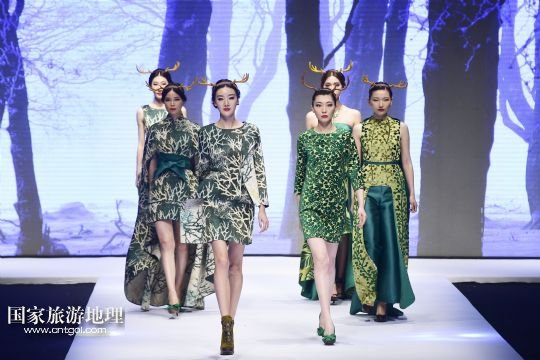 5月9日,模特在“2015杭州國際時尚周”開幕式上展示英國寶萊達(dá)服裝設(shè)計(jì)公司主題為“樹靈派對”的時裝。
