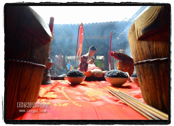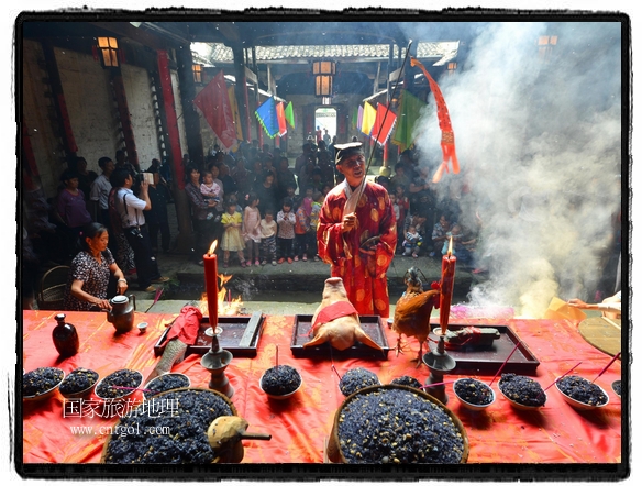 國家旅游地理 江西婺源(上饒)5月31日訊(特約記者王國紅 通訊員程新德攝影報道) “祭祀開始、鳴炮奏樂、祭拜、主持人講話、結束鳴炮”,5月25日,農(nóng)歷四月初八,石佛村烏飯節(jié),村民將自家精心制作的烏飯端進祠堂祭祀。江西省婺源縣段莘鄉(xiāng)石佛村每年都要舉行烏飯祭祖活動,各家各戶將自家精心制作的烏飯端進祠堂……