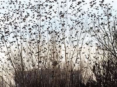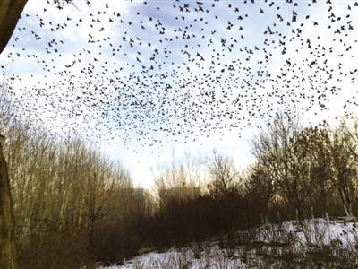 2015年12月30日下午,我在銀川市興慶區(qū)北塔公園游覽。走到北塔東北的樹(shù)林邊,突然看見(jiàn)一棵有些怪異的樹(shù)——數(shù)九寒冬,為何還有這么多樹(shù)葉?仔細(xì)一瞧,哪是什么樹(shù)葉,是數(shù)千只麻雀在樹(shù)上“開(kāi)會(huì)”。密密麻麻,嘰嘰喳喳,無(wú)拘無(wú)束。我拿出手機(jī),剛拍了幾張,不知是聽(tīng)了什么號(hào)令,麻雀?jìng)?ldquo;散會(huì)”了,瞬間全部飛向藍(lán)天,一個(gè)個(gè)狀如小飛機(jī)??吹贸觯槿?jìng)兺ο矚g銀川,活得挺自在。(通訊員 蓮子)